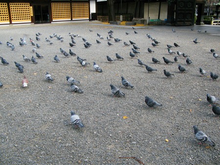 右方屋頂上停了一大群鴿子 某人在地上抓了一把碎石子往空中拋 自以為在灑飼料