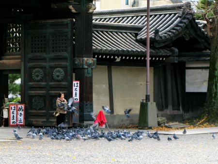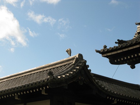 東本願寺的不知道什麼門 漂亮 屋頂上白白的是真鳥!! 原本以為是裝飾 但牠突然動了